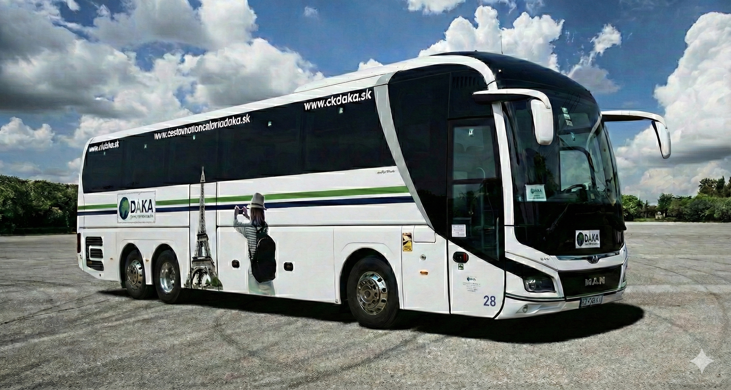 Luxusný 59 miestny moderný autobus značky MAN elegantnej bielej farby s pohodlnými polohovateľnými sedadlami vyrobený v roku 2023. Ako privítanie od nás dostanete welcome drink v autobuse v podobe praktickej fľaškovej minerálnej vody zadarmo.