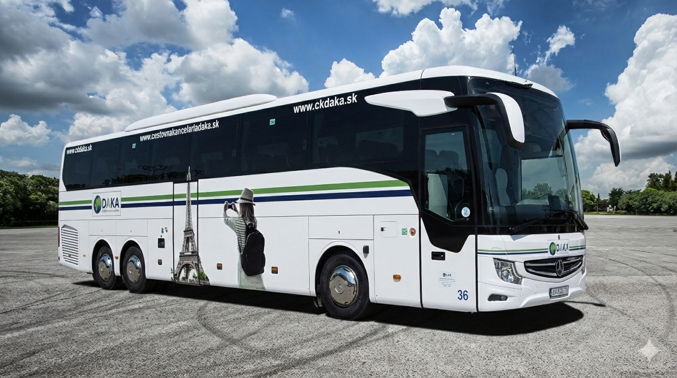 Zájazdový biely autobus Mercedes Tourismo RHD-L s komfortnými polokoženými a polohovatelnými sedadlami. Ako privítanie od nás dostanete welcome drink v podobe minerálky v autobuse zadarmo.