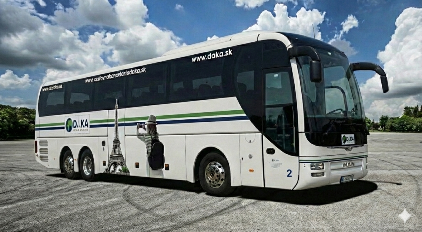 Luxusný 59 miestny moderný autobus značky MAN elegantnej bielej farby s pohodlnými polohovateľnými sedadlami. Ako privítanie od nás dostanete welcome drink v autobuse v podobe praktickej fľaškovej minerálnej vody zadarmo.