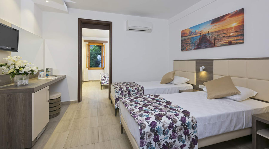 2-lôžkové (manželská posteľ alebo 2 jednolôžkové postele) izby na nižších podlažiach, individuálna klimatizácia, kúpeľňa so sprchou, WC, fén, TV-SAT, minibar (denne voda), trezor, telefón. Upratovanie izieb sa vykonáva každý deň, výmena obliečok a uterákov každé 3 dni.