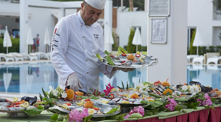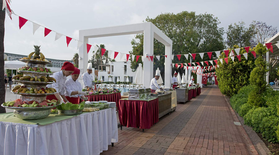 Program all inclusive zahŕňa: miestne alkoholické a nealkoholické nápoje v čase 10:00 - 00:00. Uvedené časové rozmedzie all inclusive a otváracích dôb barov môžu byť hotelom pozmenené. Raňajky, obed a večera formou bufetu sú podávané v reštaurácií (prípadne podľa rozpisu) v nasledujúcich časoch: 07:30 – 10:00 raňajky, 10:00 - 10:30 neskoré raňajky, 10:00 - 18:00 zmrzlina, 11:00 - 16:30 snack (aquapark), 11:00 - 16:30 Gözleme (bar na pláži - mimo nedele), 11:00 - 17:00 káva a sušienky (čajovňa), 12:30 – 14:00 obed, 19:00 – 21:00 večera, 23:00 - 00:00 nočné občerstvenie.