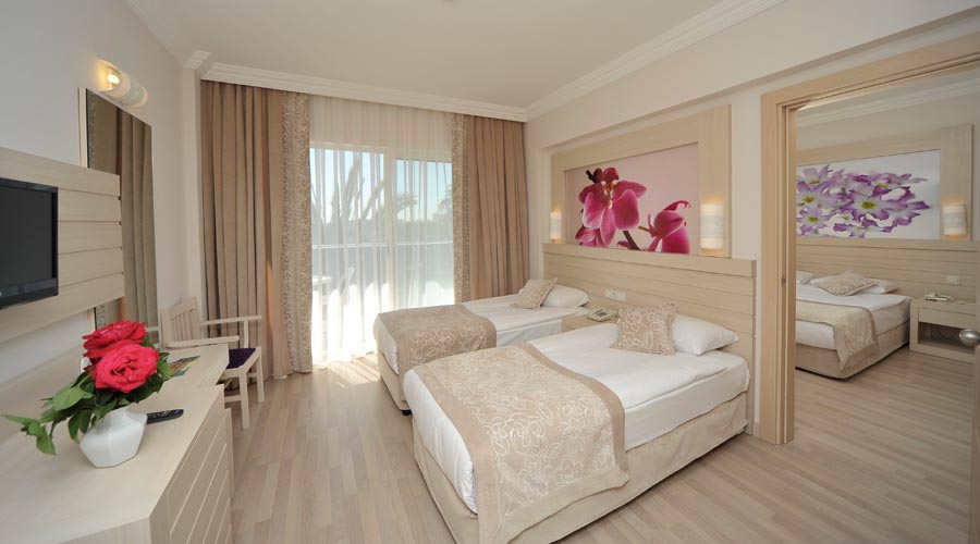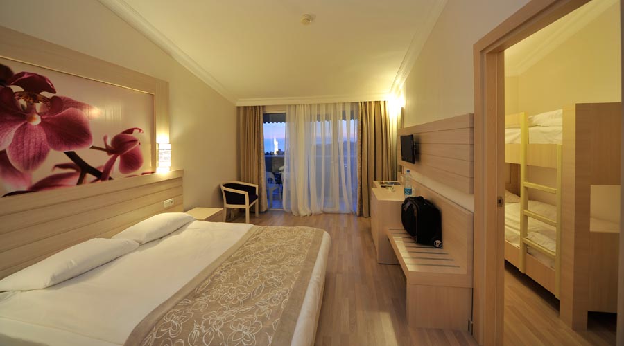 Rodinný izba s poschodovou posteľou - Maximálna obsadenosť: 2 x dospelý + 2 x dieta. Priemerná rozloha izby: 30 m² 4-lôžkové (manželská posteľ a poschodová posteľ) izby, 2 x oddelená miestnosť so spoločnou kúpeľňou so sprchou, individuálna klimatizácia, WC, fén, 2 TV-SAT, minibar, konvica, telefón, trezor, balkón. Upratovanie izieb sa robí denne, výmena posteľnej bielizne 3 x týždenne.