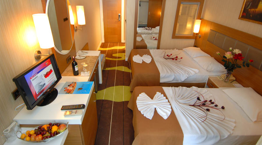 3-lôžkové (manželská posteľ a jednolôžková posteľ) izby, alebo 2-lôžkové (manželská posteľ, alebo 2 x jednolôžkové postele) izby, kúpeľňa so sprchou, individuálna klimatizácia, WC, fén, TV-SAT, minibar, telefón, trezor, balkón. Upratovanie izieb sa robí denne, výmena uterákov a posteľnej bielizne 3 x týždenne.
