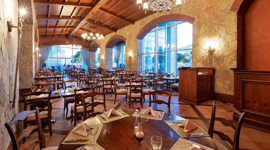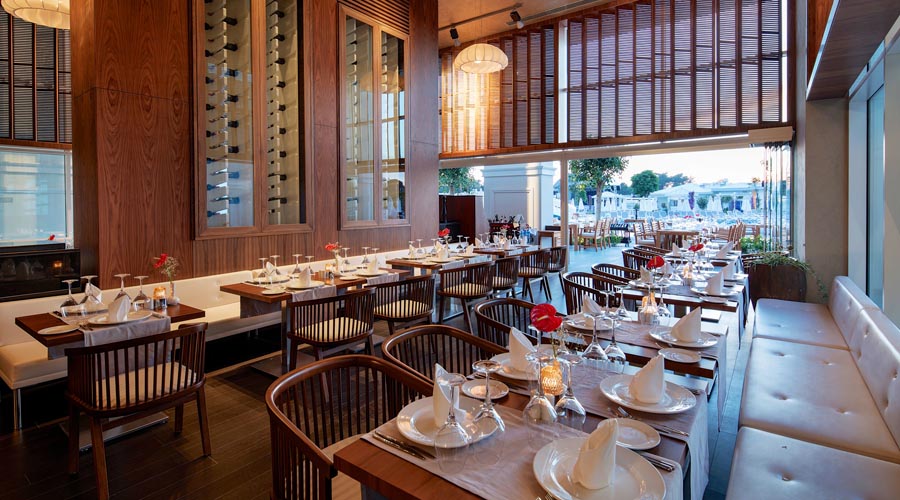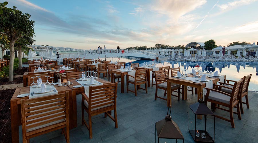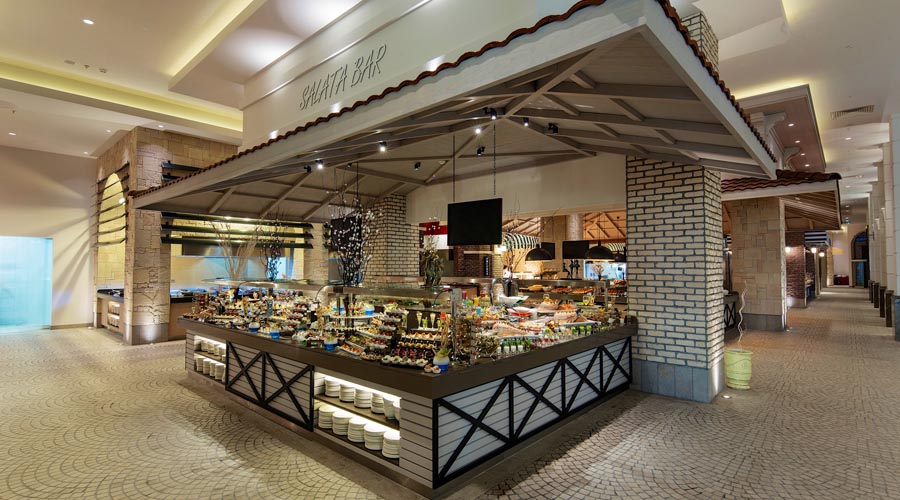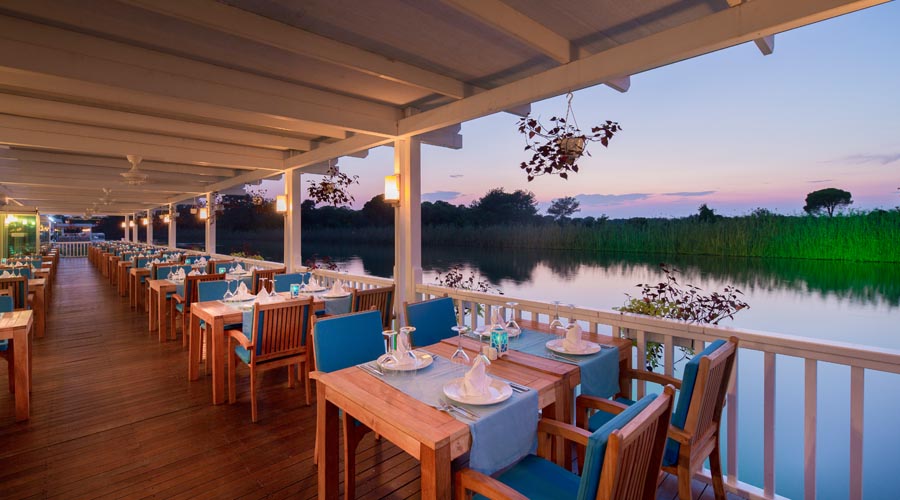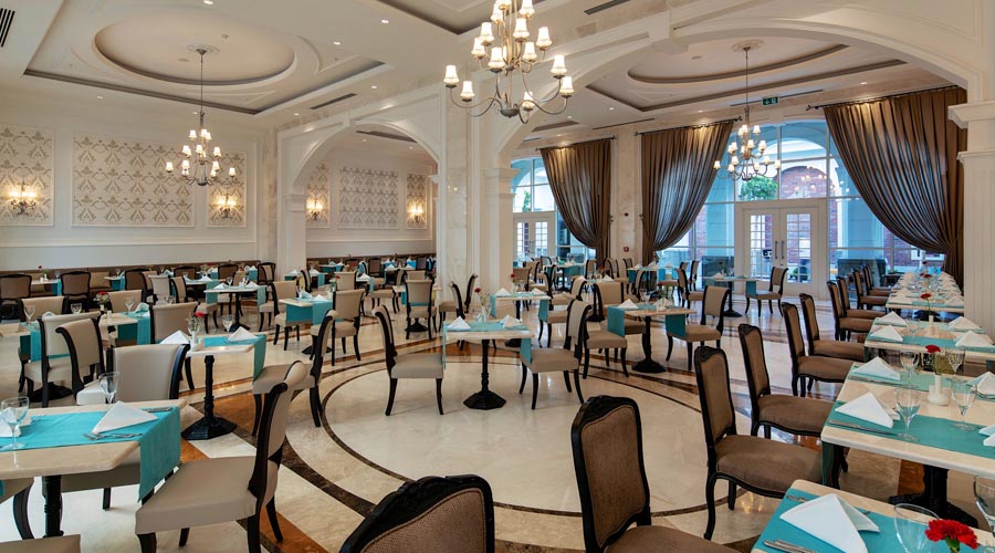 Program high class all inclusive zahrňuje všetky miestne alkoholické, vybrané dovážané alkoholické a nealkoholické nápoje 24 hodín denne. Uvedené časové rozmedzie high class all inclusive a otváracie hodiny barov môžu byť hotelom zmenené 07:00-11:00 Raňajky (hlavná reštaurácia – súčasťou sú reštaurácie Diverso, Hürrem, La Paglia, Classico, Moderno), 11:00-21:00 Zmrzlina (Ice bar), 12:00-14:00 Obed (hlavná reštaurácia – Poppetova železnica časť pre deti), 12:30-14:30 Obed (hlavná reštaurácia – súčasťou sú reštaurácie Diverso, Hürrem, La Paglia, Classico, Moderno), 12:30-18:00 Snack (Stella snack reštaurácia na pláži), 12:30-18:00 Snack (Green Lagoon snack reštaurácia), 14:30-19:00 Cukráreň (Caprice bar), 18:30-20:30 Večere (hlavná reštaurácia – Poppetova železnicačasť pre deti), 19:00-21:30 Večere (hlavná reštaurácia – súčasťou sú reštaurácie Diverso, Hürrem, La Paglia, Classico, Moderno), 00:00-03:00 Nočné občerstvenie (Pascarella reštaurácia), 19:00-23:00 Pascarella talianska a’la carte reštaurácia, 19:00-23:00 Okeanos rybia a’la carte reštaurácia, 19:00-23:00 Hasır turecká a’la carte reštaurácia, 19:00-23:00 Na lodi a’la carte reštaurácia, 19:00-23:00 V altánku a’la carte reštaurácia, 19:00-23:00 Beef Grill Club hovädzí steak a’la carte reštaurácia – vyhradené pre klientov ubytovaných vo vilách, 09:00-18:00 Solaris bar na pláži, 09:00-19:00 Olympic bar pri bazéne, 09:00-20:00 Citrus vitamín bar, 09:00-23:30 Caprice bar, 09:00-23:30 Cordelia lobby bar, 09:00-00:00 Centric bar pri bazéne, 09:00-00:00 Aristocrat lounge bar, 10:00-19:00 Aqua bar pri bazéne, 10:30-19:00 Comfort bar pri bazéne, 16:00-00:00 Target bowling bar, 18:00-23:30 Kaviareň baby, 23:30-03:00 Eternity disco bar, Noble írsky bar v prevádzke 24 hodín denne.