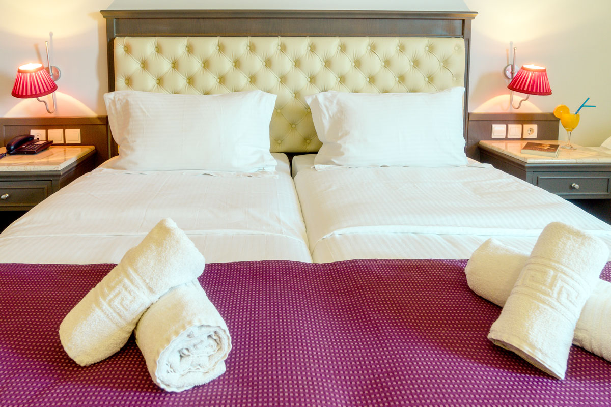 Izby sú vybavené jednotkou tichej klimatizácie (VRV od spoločnosti Daikin), bezplatným Wi-Fi pripojením na internet a 32 "satelitnou LED TV. Priestranné kúpeľne sú vybavené príslušenstvom„ Grohe “, sklenenou dažďovou sprchou, wc a vysoko kvalitnými kúpeľňami. toaletné potreby. Naše luxusné dvojlôžkové izby sa nachádzajú na všetkých poschodiach a každá má vlastný balkón s výhľadom na more, mesto alebo na vnútorné nádvorie hotela. Dvere sa ovládajú pomocou Hi-Tech RFID kariet a každá izba má zvonček s digitálnym displejom, na ktorom môžete pre svoje pohodlie zobraziť správy „Clean My Room“ a „Nerušiť“.