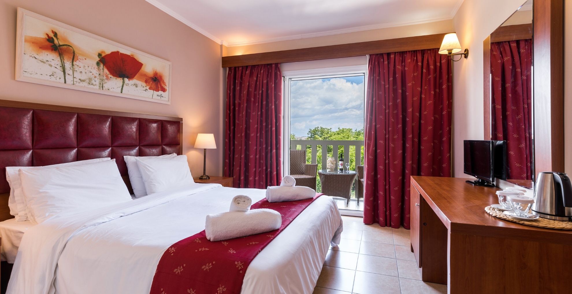 Dvojlôžková izba s výhľadom na jazero (veľkosť 24 m²). Ideálne pre páry a hostí prichádzajúcich za oddychom. Môžu sa tu ubytovať až 3 dospelí s oddelenými posteľami. Kúpeľňa s vaňou, sušičom vlasov, toaletnými potrebami, TV, telefónom s priamou voľbou, minichladničkou, práčovňou, klimatizáciou a bezplatným Wi-Fi pripojením na internet. Všetky izby majú balkón s výhľadom na hory a mesto. Balkón s výhľadom na morské jazero a polostrov Kanoni.