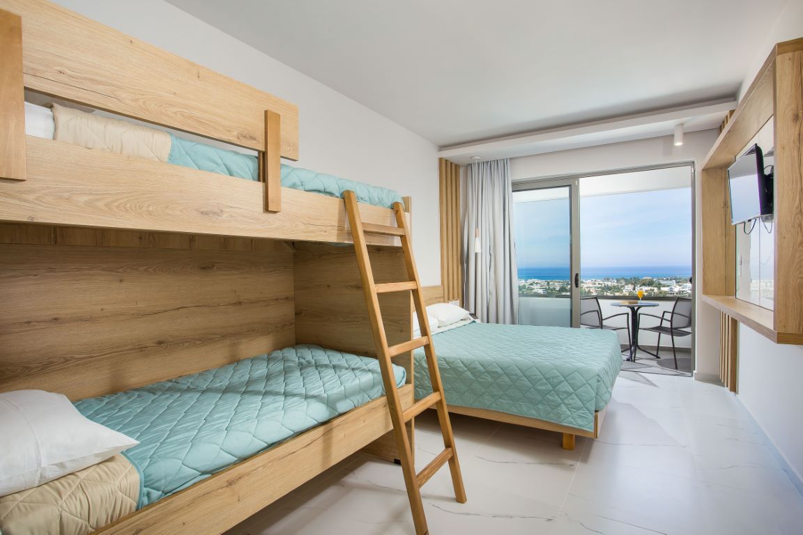 Vybavenie a poskytované služby: Kúpeľňa so sprchou, poschodové postele, skriňa, denné upratovanie (okrem nedele), telefón s priamou voľbou, súkromný balkón, manželská posteľ, plochý televízor, fén, individuálne ovládaná klimatizácia, rýchlovarná kanvica, chladnička, trezor, bezplatné Wi-Fi pripojenie na internet.