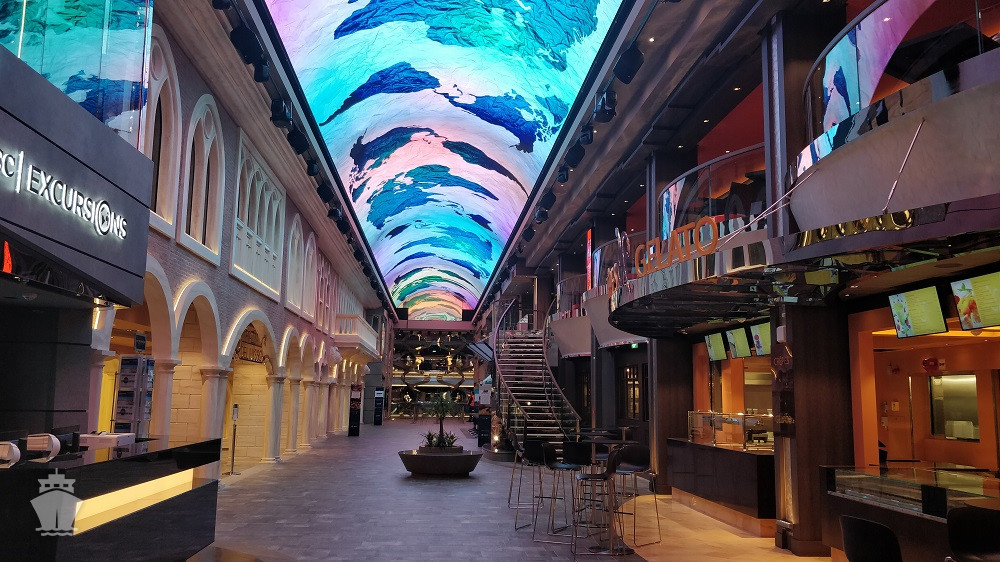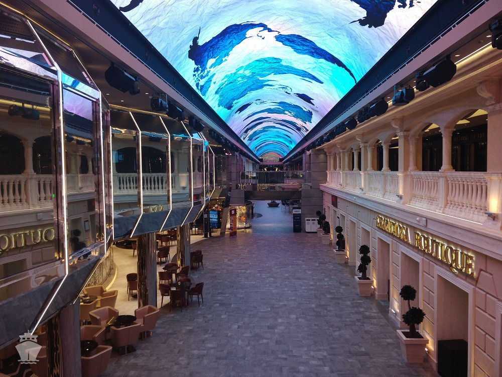 • Dvojúrovňová promenáda s reštauráciami, barmi a duty-free obchodmi, zastrešená 480 m² LED “digitálnou oblohou” s vizuálnymi show