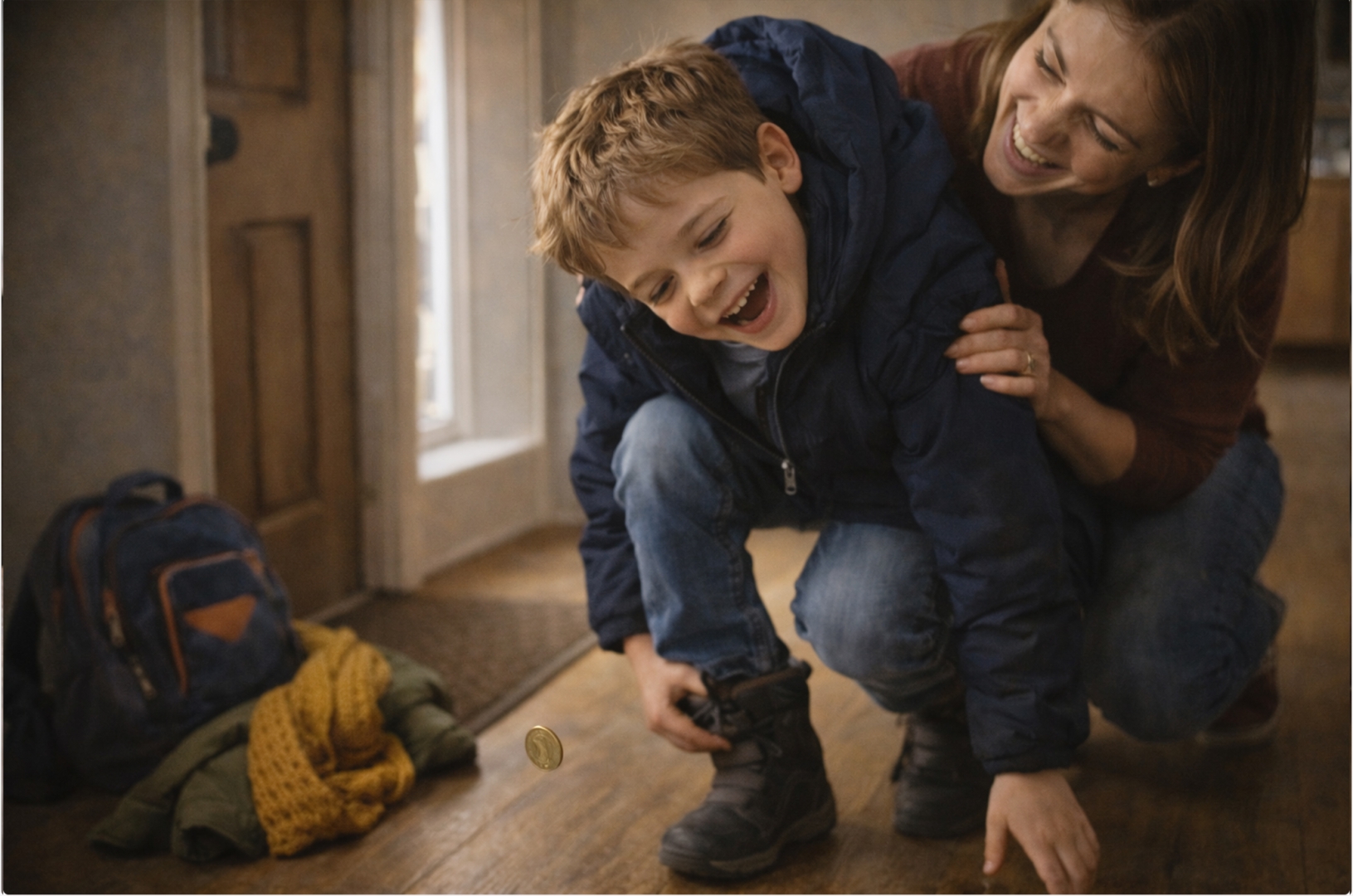 Nedávno sme sa chystali ráno do školy, syn si išiel zapnúť čižmy a ako sa zohol tak z neho vypadlo 1€ tak ako bol zahnutý som s nim zo srandy zatriasla či ešte s neho niečo nevypadne zo slovami ,,oslík otras sa" tak sme sa spolu už dávno nenasmiali...