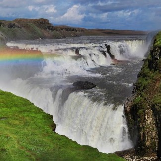 vodopád Gullfoss, najmohutnejší vodopád v Európe kde uvidíme skutočnú silu atraktívnej islandskej prírody a výhľad naň si užijeme s viacerých fotomiest v blízkosti, ak budeme mať šťastie na počasie výhľad bude doplnený o krásnu farebnú dúhu.