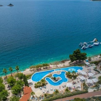 Na prvý pohľad rezort pôsobí ako premyslené miesto, ktoré kombinuje pokoj malého prímorského sídla s komfortom väčšieho dovolenkového strediska: chodníky vedú popod tienisté koruny stromov, terasy sú upravené tak, aby aj spodné rady apartmánov mali výhľad na záblesky mora, a atmosféra je pokojná, hoci stále ľudská. Recepcia rezortu je vstupnou bránou k pohodliu — personál sa stará o všetko potrebné od ubytovania, cez informácie o výletoch až po základné administratívne záležitosti. Priamo v areáli sa nachádza obchod, kde je možné zakúpiť bežné potravinové a hygienické potreby, malé stánky so suvenírmi dopĺňajú služby rezortu. Ak si prajete obed či večeru bez plánovania, reštaurácie a bistrá poskytujú široký výber jedál: od rýchlych plážových sendvičov a ľahkých šalátov, až po miestne dalmátske špeciality či taliansku kuchyňu — ideálne riešenie pre večery, keď sa nechce variť. Pre tých, ktorí si cenia pokojný relax pri vode, sú k dispozícii plážové bary a lehátka pri bazéne, takže popoludní sa dá pohodlne presunúť medzi morom a bazénom.